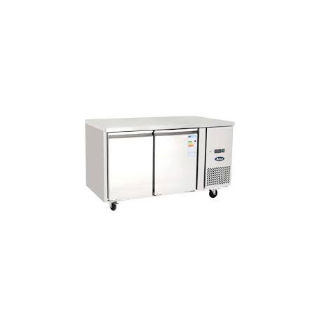Double door under counter chiller with caster wheels fitted on it. Comes with a flat top that can be used as a working top.